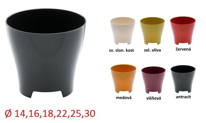 Lesklý obal na kvetináče určený do interiéru z kvalitného a odolného plastu. Jeho špeciálny tvar zabraňuje vzniknutiu kruhov od vody na nábytku alebo podlahe - obal má 3 nôžky v tvare listu, ktoré zabraňujú zrážaniu vlhkosti zo spodu kvetináča. Farva je dostupná v 6 veľkostiach, môžete si tak vytvorit celú kolekciu.